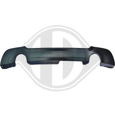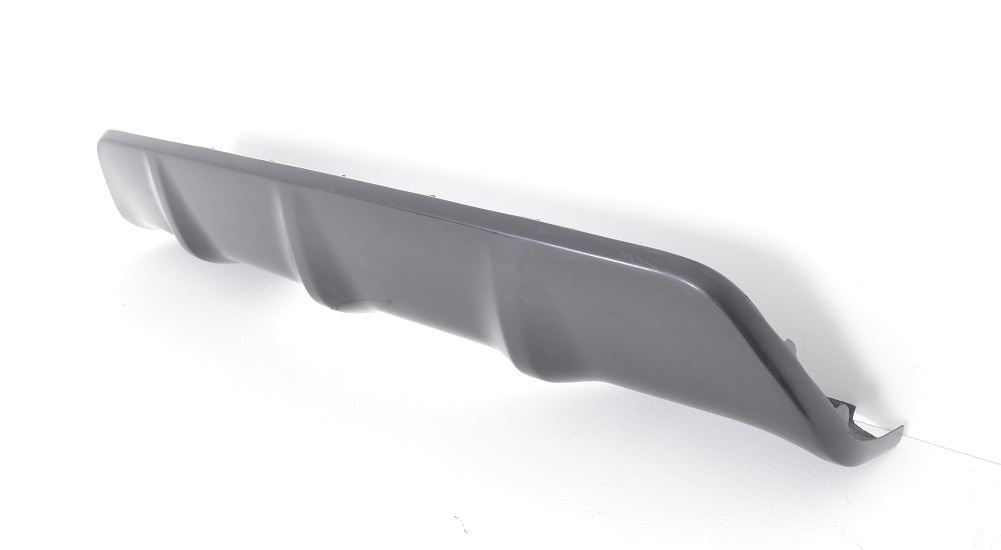 Rear bumper diffuser with dual exhaust openings. Made of fiberglass and requires painting before installation.