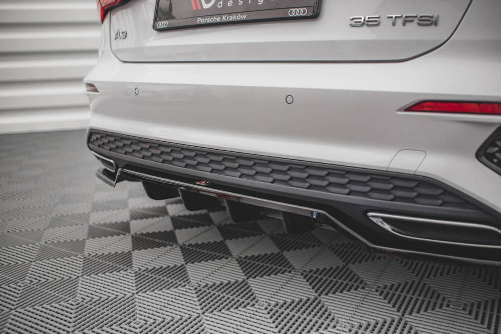 Rear bumper central splitter with vertical bars. Gloss black, ABS. Fits Audi A3 S-Line Sportback 8Y 2020 -