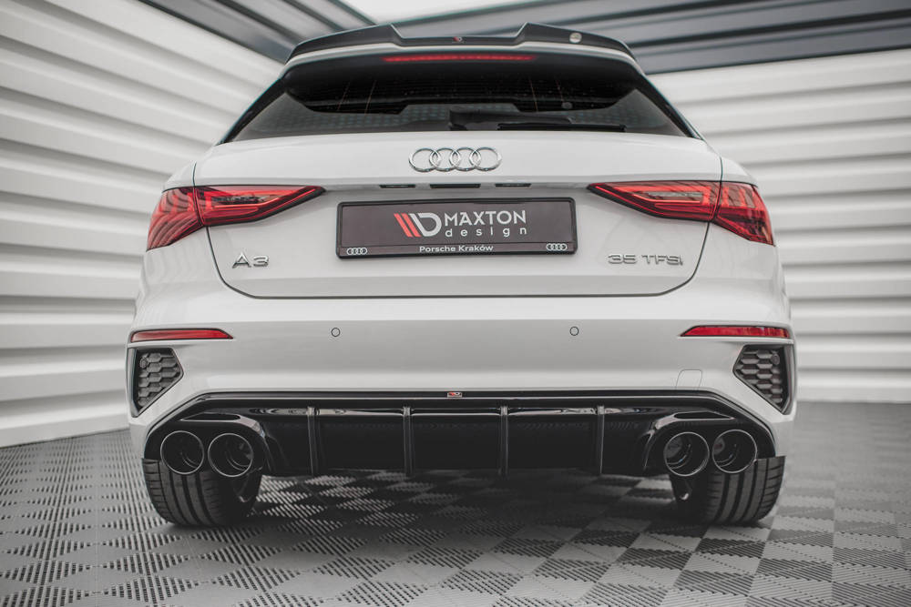 Rear valance + exhaust enda imitations, gloss black, ABS. Fits Audi A3 S-Line Sportback 8Y 2020 -
