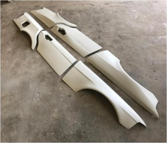 GEN1/GEN2 E500/E63 front wide fenders (left + right). Suitable with bumpers W124-FR-02L and W124-E500-FR-01L. Made of fiberglass. Needs painting before installation.